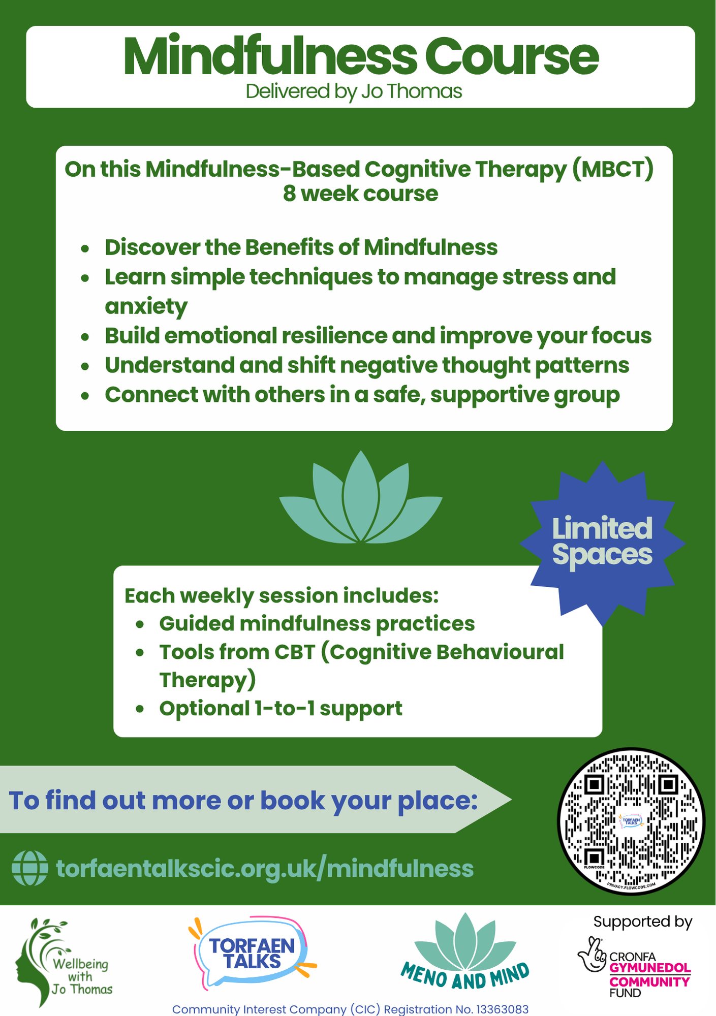 As a qualified MBCT practitioner I provide and facilitate 1:1 and group mindfulness sessions and tailored courses. This includes the MBCT 8-week programme recognised by the NHS as best practice. Mindfulness can be a powerful tool for individuals seeking support during challenging times. By fostering a present-focused awareness, mindfulness helps individuals observe their thoughts and feelings without judgment, creating a sense of space and perspective. It is particularly helpful for: